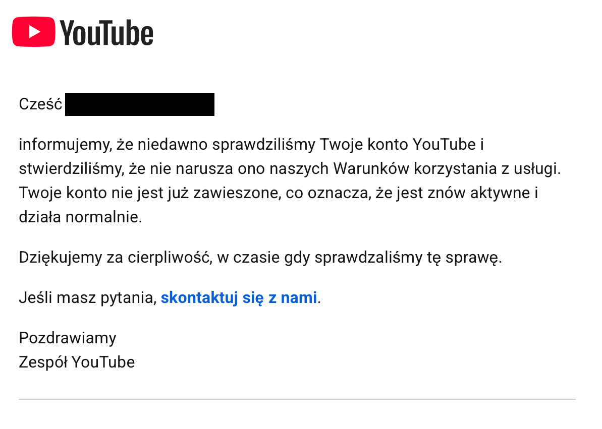 Pierwsza odpowiedź była odmowna. To standardowy scenariusz. W takich sprawach kluczowe jest jednak to, co dzieje się dalej, a nie pierwsza reakcja platformy. Działania były kontynuowane kilkoma niezależnymi ścieżkami prawnymi. Konsekwentnie podważałem zasadność blokady, wskazując na obowiązki wynikające z prawa unijnego i brak ich realizacji w tej konkretnej sprawie. Efekt? Konto zostało przywrócone i ponownie działa na YouTube. Klient otrzymał następujący komunikat: